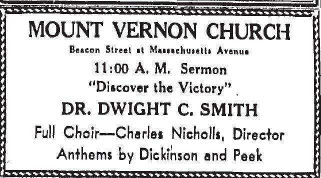 Dr. Dwight Chichester Smith accepted a call to Mount Vernon Church on January 1, 1948 to become its seventh minister. He was born in Elizabeth, N. J. in 1900. After his graduation from Yale University in 1922, he taught English at Yale in China for two years. This valuable experience in the Orient was followed by graduate study at Yale Divinity School where he received his Divinity